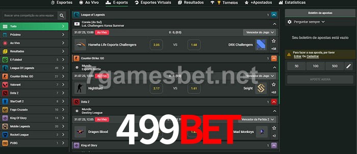 O 499Bet oferece uma grande seleção de opções de apostas em e-sports com probabilidades competitivas